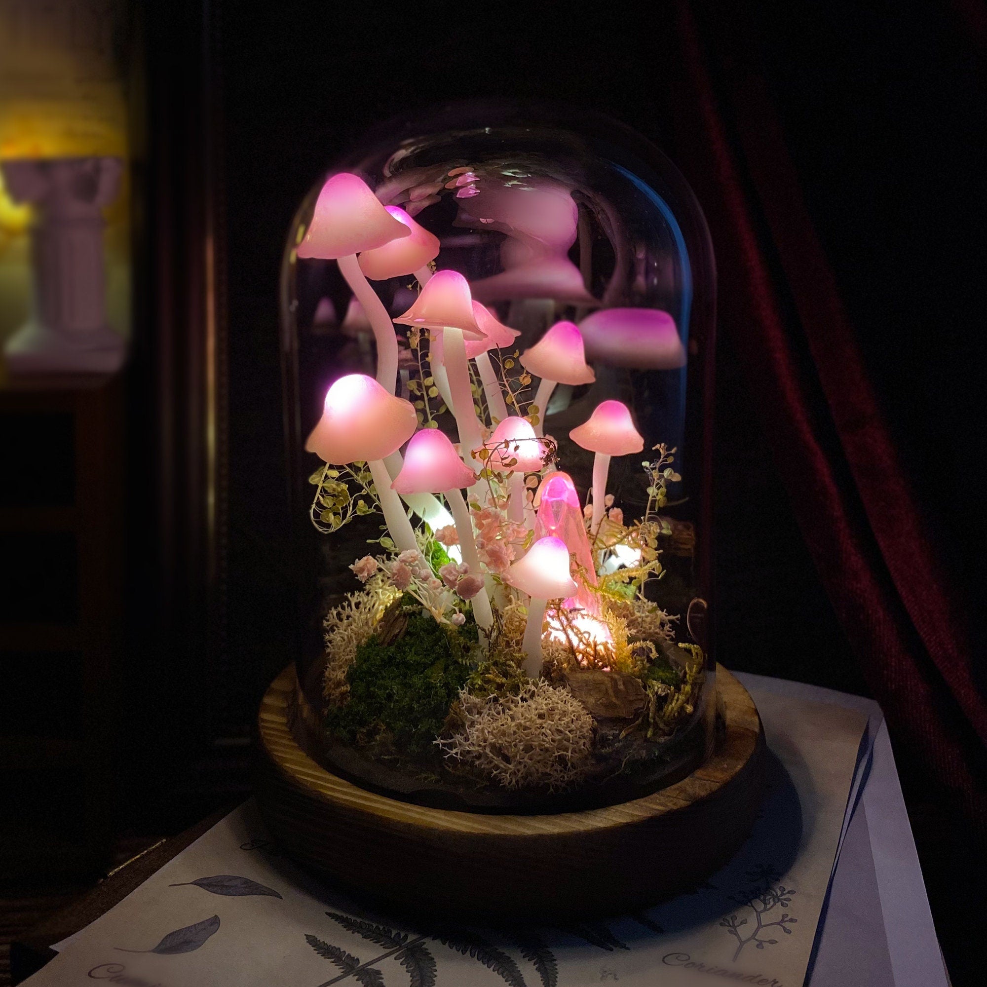 Material: wooden base, glass dome, clay mushrooms, preserved flower, reindeer moss, rattan, crystal, LED light,