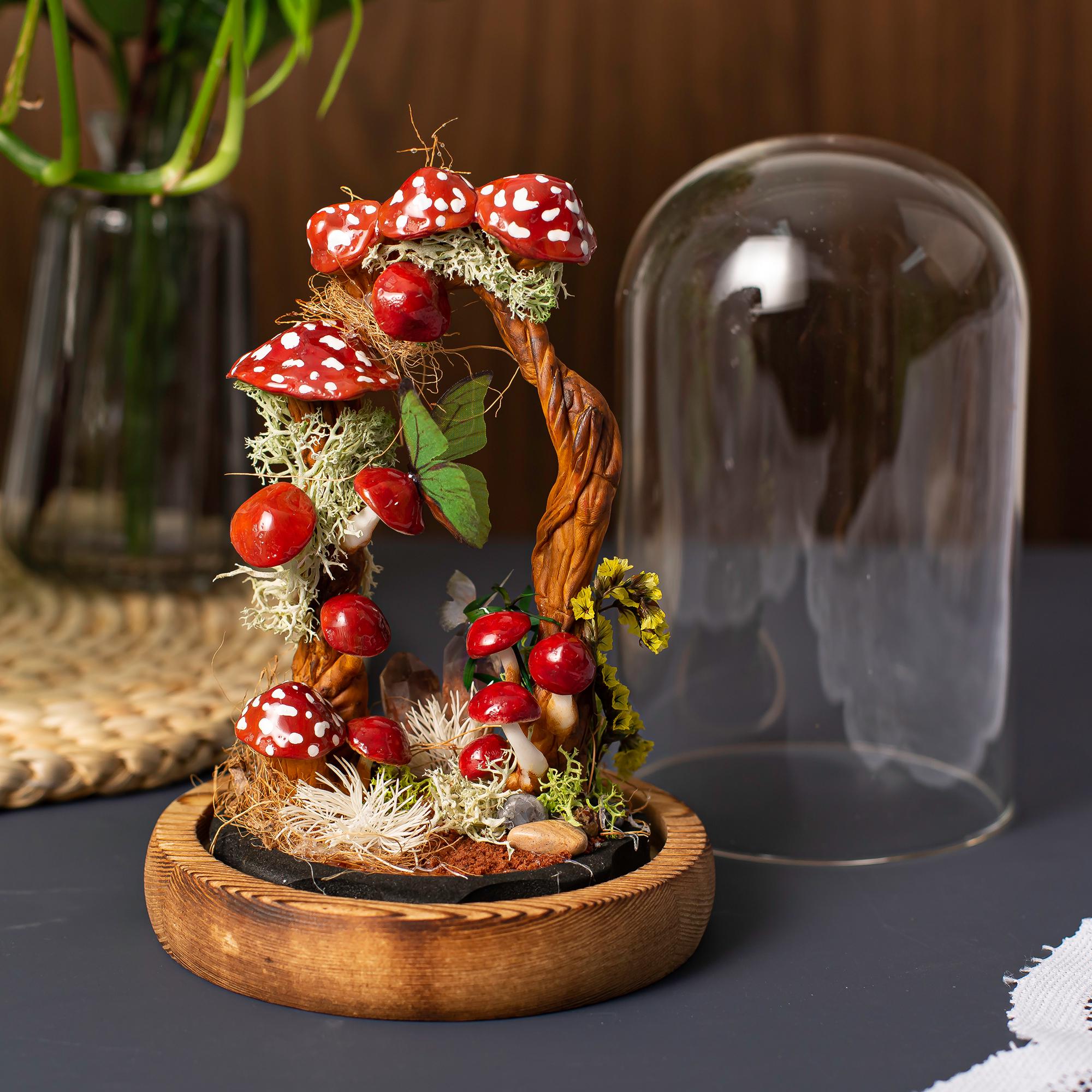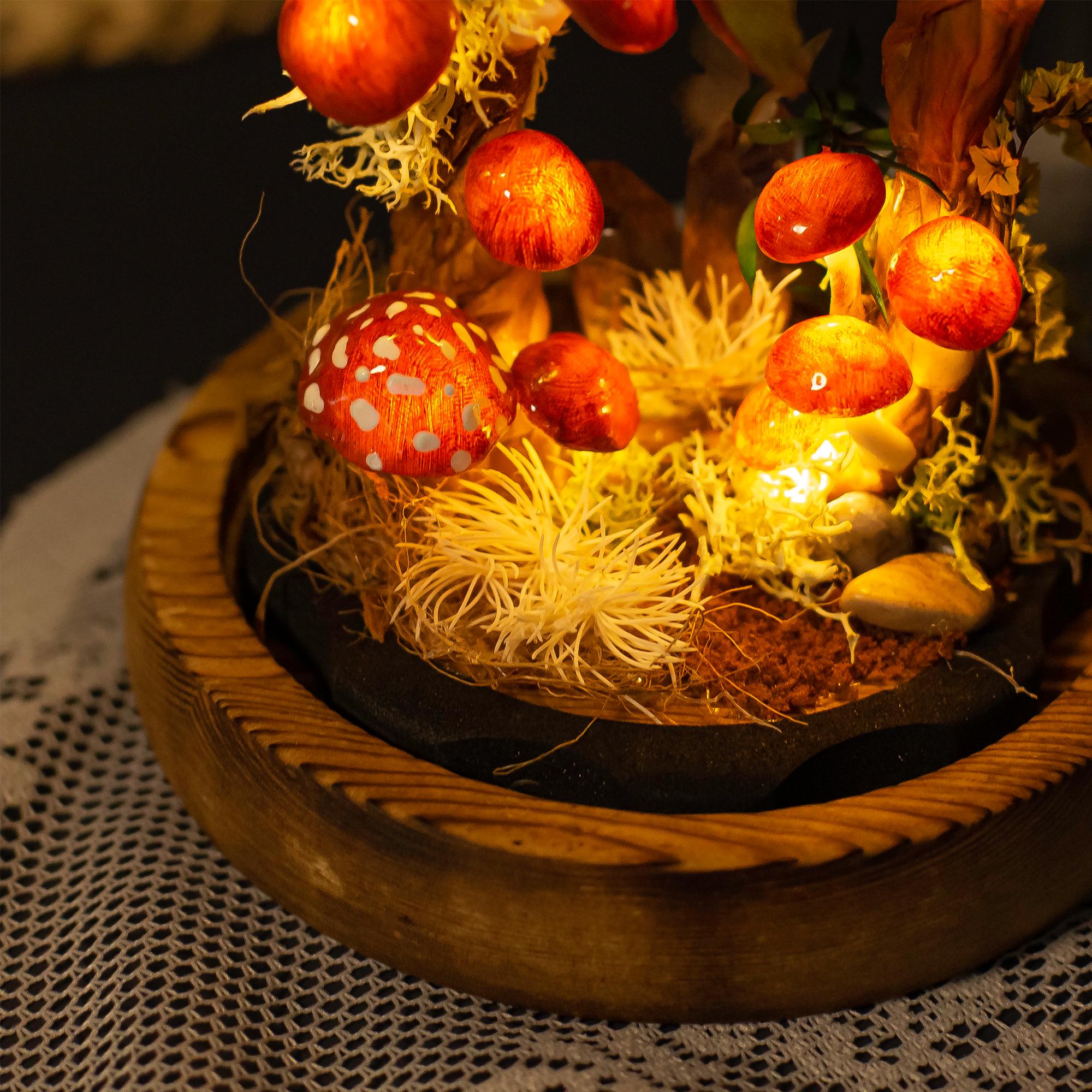 Material: wooden base, glass dome, clay mushrooms, preserved flower, reindeer moss, rattan, crystal, LED light,